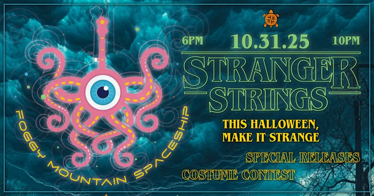 “Stranger Strings” Halloween Party featuring a live performance from Foggy Mountain Spaceship, the once-annual release of some candy-themed beers, and a costume contest w/ prizes!