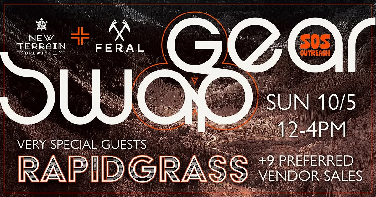 Shop deals on used outdoor goods and sell your extra items at our next Gear Swap & Sample Sale 12-4pm with Rapidgrass 1-4pm. This is a classic peer-to-peer swap with giveaways that will benefit SOS Outreach who changes young lives through mentoring outdoors.